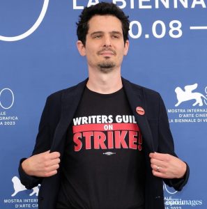 يقف رئيس لجنة التحكيم مهرجان فينيسيا بقميص لدعم نقابة الكتاب وأعضاء SAG-AFTRA خلال مهرجان البندقية السينمائي الدولي السنوي الثمانين، في فينيسيا، إيطاليا.