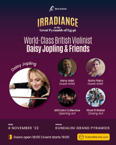 تعزف لاعبة الكمان البريطانية العالمية/ ديزي جوبلينج تحت سفح الأهرامات لأول مرة وذلك في حفل رائع يُشارك فيه فنانون مصريون وعالميون من بينهم المغني/ هاني عادل وفرقة وسط البلد، ومغنية الجاز/ نهى فكري، بجانب فرقة موسيقية مكوّنة من اللاجئين وفناني فرقة أفروكايرو ويجمعهما سويًا مخرج الحفل الموسيقي/ أحمد عمر.